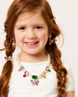 - Set includes one stretchy gem-studded necklace, one pair of clip-on earrings, and two adjustable rings