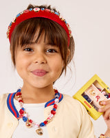 - Features a mix of red, blue, and clear beads, plus team logo charms